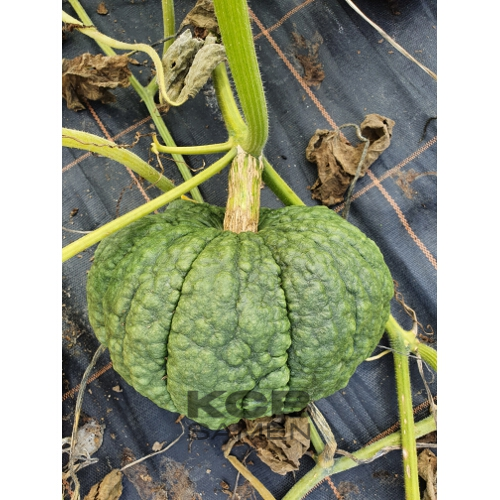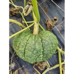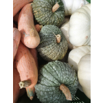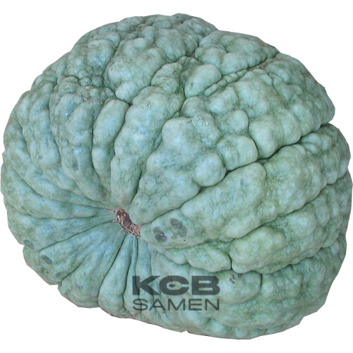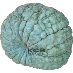 Fruit: vert gris, rond et applati, fortement ridé; Taille (DxH): 30 x 15 cm; Chair: orange;