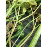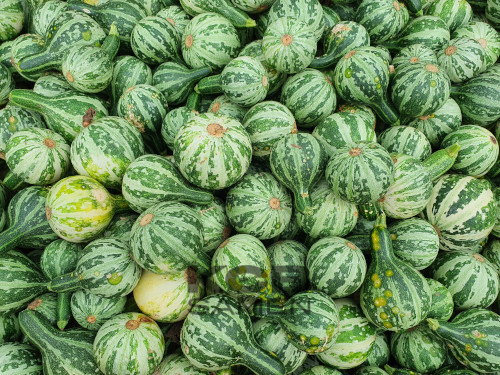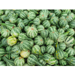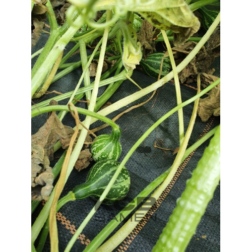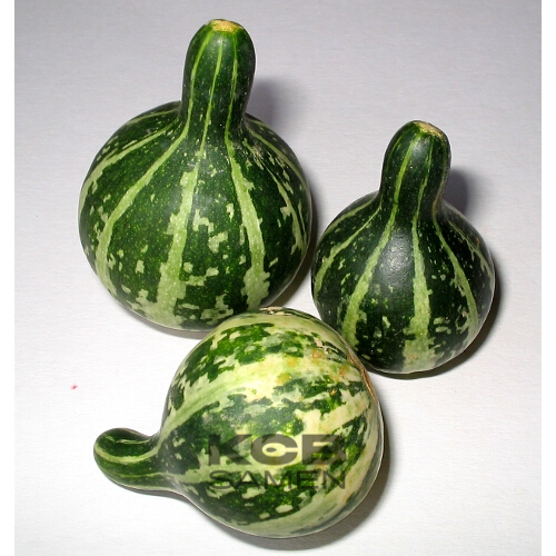 Citrouille très petite avec de rayures verts, citrouille en forme de poire; 3 - 5 cm; Fruits pâlir avec beaucoup de soleil. Si possible accrocher les vignes aux poteaux.