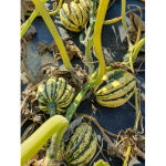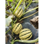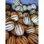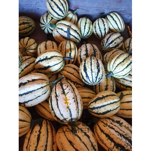 Jester est un sorte de Delicata ronde, douce et légèrement plus fibreuse. Elle a un goût très savoureux, idéale pour le repas d'une personne. Probablement un croisement entre Delicata et Acorn.