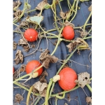 Fruit: applati et rond, uniforme, peau lisse; Taille (HxL): 12x8 cm; Chair: orange-rouge brillante, très douce et aromatique;