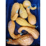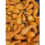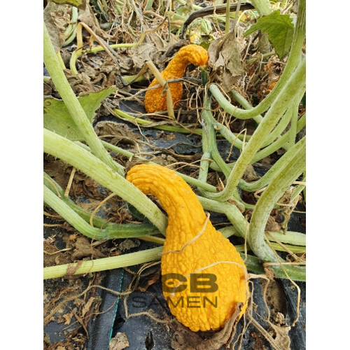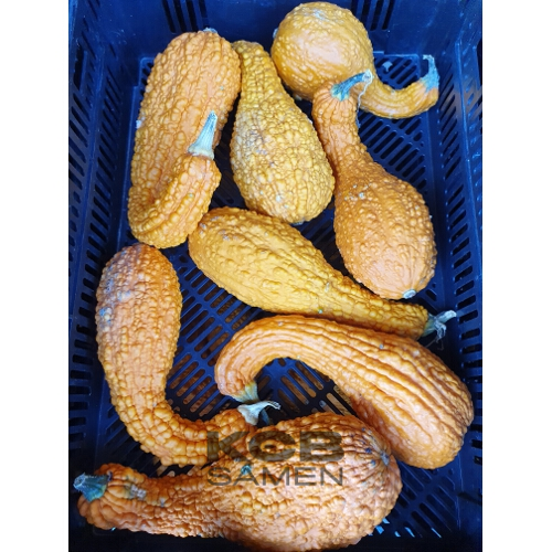 Fruchtform: gekrümmte Keule; Fruchtgrösse (DxL): 7 - 10 cm x 15 - 25 cm; Fruchtfleisch: gelblich bis cremefarben; Für den Verzehr bei 10-12 cm ernten, für Dekozwecke ausreifen lassen;