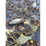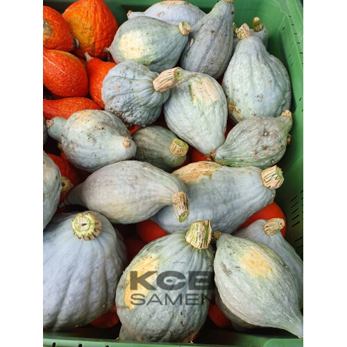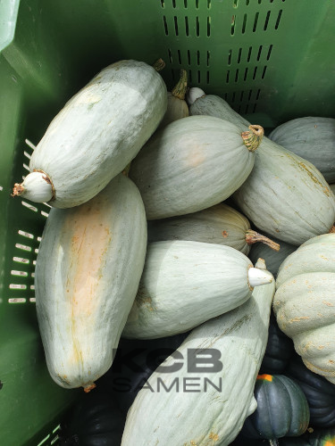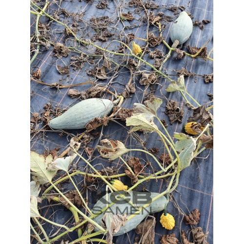 Fruchtform: gleichmässig, uniform, grau, länglich; Fruchtgrösse (DxL): 20 x 30 cm; Fruchtfleisch: orange, mitteldick, süss;