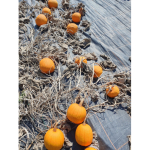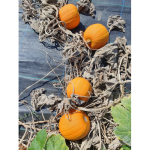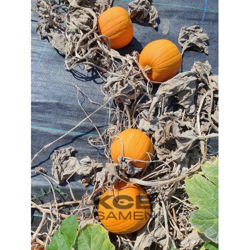 Fruchtform: dunkelorange, leicht gerippt, rund; Fruchtgrösse: (D): 12 cm; Fruchtfleisch: orange;