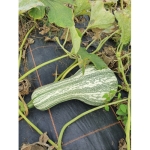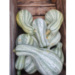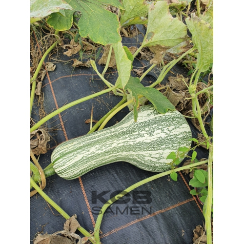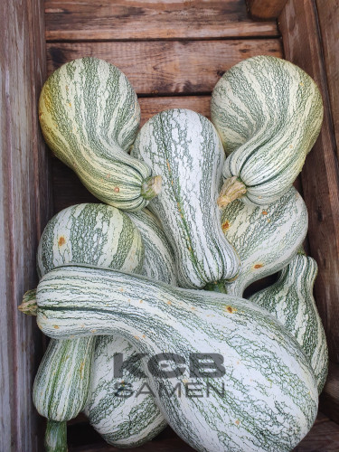 Fruchtform: grün gestreift, weiss, marmoriert, flaschenförmig; Fruchtgrösse (DxH): 20 x 40 cm; Fruchtfleisch: hellgelb;
