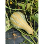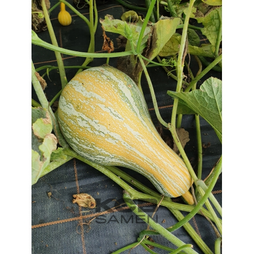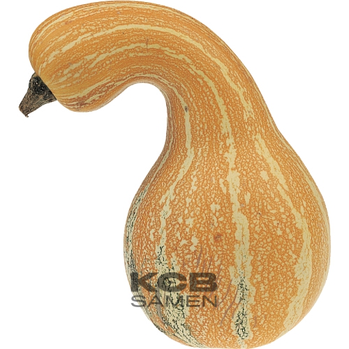 Fruchtform: grün/orange/weiss marmoriert, flaschenförmig; Fruchtgrösse (DxH): 16 - 25 cm x 35 - 45 cm; Fruchtfleisch: gelb; 2 -3 cm dick; feinkörnig, leicht fruchtig, feiner Kürbisgeschmack;
