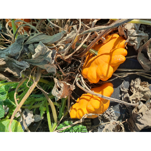Wunderschöne, sehr grosse Patisson, lange verschollen, heute wieder gefunden! Die Früchte erreichen einen Druchmesser von rund 30 cm und wiegen bis zu 3 kg. Die Früchte sind uniform und haben schöne teils nach oben, teils nach unten gekröpfte Finger;