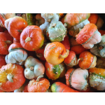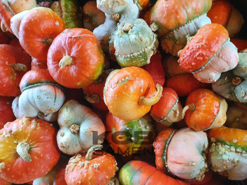 Fruchtform: turbanförmig, mit einer dünnen aber breiten und knallroten Basis und einem grossen weissen Blütenansatz; Fruchtgrösse (DxH): 12 x 10 cm; Fruchtfleisch: fast dunkelorange, dick, durchschnittliche Qualität;