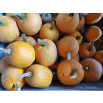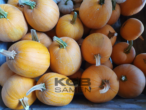 Fruchtform: gleichmässig, rund, rau, orange; Fruchtgrösse (D): 15 - 25 cm, selten mehr; Fruchtfleisch: gelborange, mit einem feinen und diskreten Aroma;