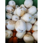 Fruits: white, round, somewhat flattened; Size (DxL): 15 - 23 cm x 13 - 20 cm; Flesh: dark orange, almost brown, thick and firm, mealy and fine, sweet, mit a marroni taste;