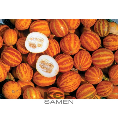 Ornemental melon also named Queen Anne's Pocket, 5 - 7 cm, orange, yellow-orange striped. It is edible. Victorian women carried Plum Granny in their pockets for the perfume-like quality.