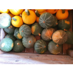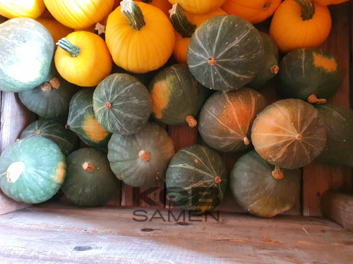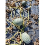 Fruits: grayish-green, round, flattened on handle side somewhat pointed on other siede. Size (DxH): 25 x 20 cm; Flesh: orange-yellow, sweet, fine grained and good flavor.